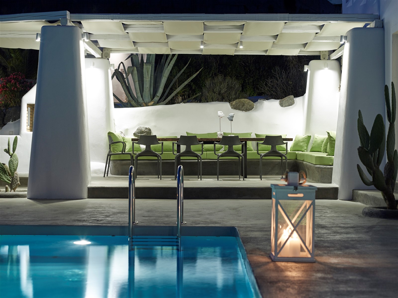 - Amenities: Air conditioning, bathrobes/slippers, CD player, Fully equipped kitchen, Hair dryer, Indoors spa, Outdoor Features, Outdoors dining, Pergola, Private pool, Safety box, Satellite TV, Sea view terraces, Wi-Fi access